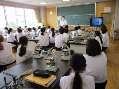 理科の授業では、顕微鏡の使い方について勉強しています。1人1台顕微鏡が渡されており、実際に使いながら部品の名称などを確認していました。先生の話を聞く姿勢が大変立派でした!