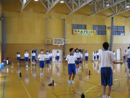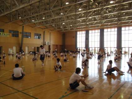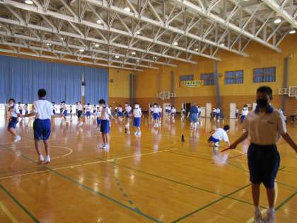 保健体育では、縄跳びをしています。前半は、テンポの速い音楽が流れている間は、前跳びや二重跳びをします。テンポのゆっくりな音楽の間は次の準備の時間です。後半は、「連続2分間飛び続けろ選手権」が行われました。号令と共に、スタートし、引っかかると、座ります。2組女子がたくさん残っていました。