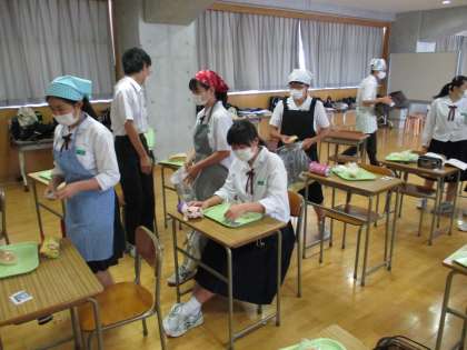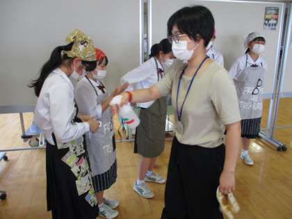 給食当番は、手洗いの後にスプレーで手を消毒し、配膳を行いました。初めての「簡易給食」に生徒たちも興味津々・・・。