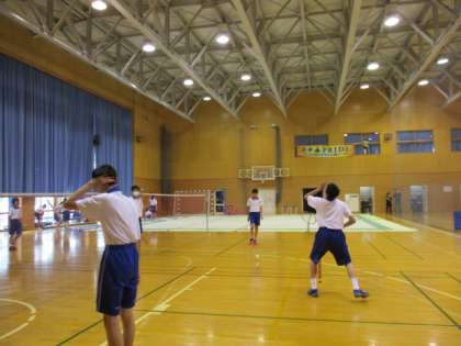 上:男子バドミントン=3年生と1年生のペアで練習しています。