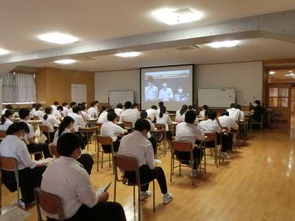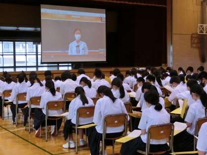 例年だと5月上旬に行っている生徒総会を本年度は、臨時休業期間を経ている関係で1か月遅れて本日開催しました。また、感染症対策として、1年生のみ体育館に入場して密を避けた状態で着席し、2,3年生はオンラインシステム(webex)を活用して、各教室で参加しました。初めての試みで、最初はとまどう部分もありましたが、各場所でしっかりと参加することができました。