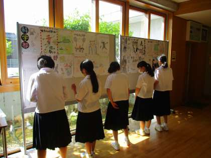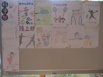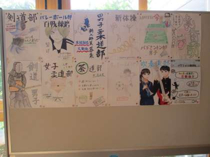生徒玄関に各部の力作が掲示してあります。1年生は掲示板の前を通るたびに、相談しているようです。