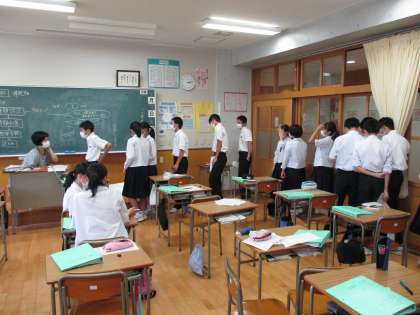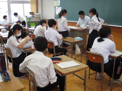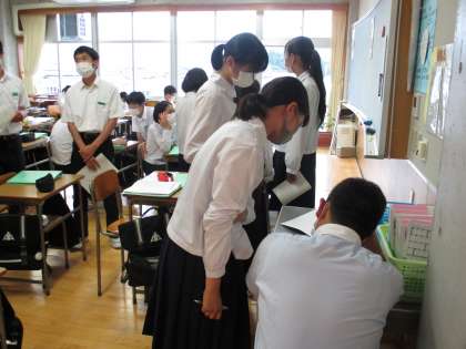 総合的な学習の時間では、平和学習として「感染症と平和」について考えています。前回の授業では、1人1人が自分のトピックについて発表しました。それを受けて、今日は課題設定を行いました。担任の先生にチェックをしてもらいながら決定しました。クラスによっては、長蛇の列もできるほど・・・。次回からは課題追究です。