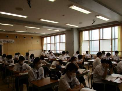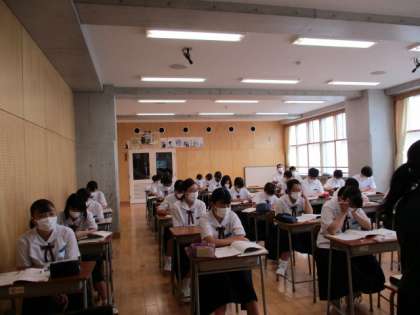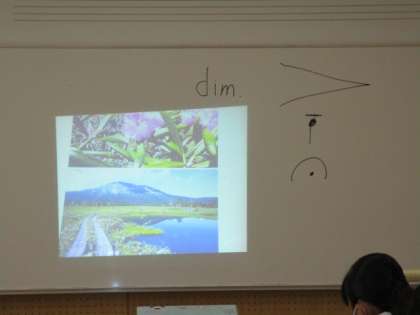 音楽では、「夏の思い出」の歌詞を分析し、この歌詞がどんな思いで書かれたのか考えました。イメージしやすいように、尾瀬の写真を書画カメラで映しています。