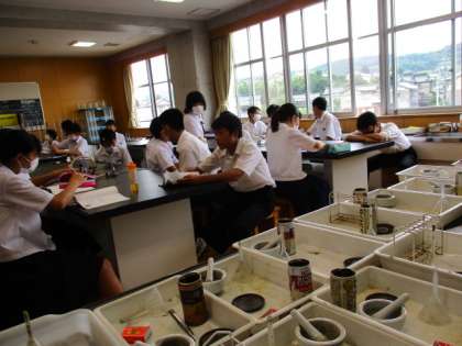 理科では、鉄と硫黄の化合実験を行いました。生徒たちは、発生した硫化水素の腐卵臭に興奮していました。