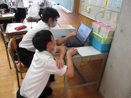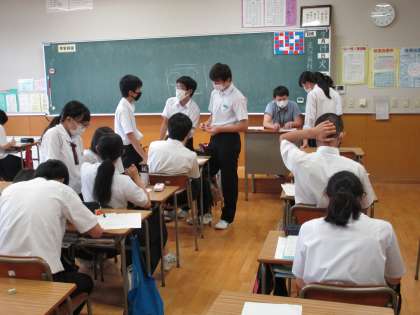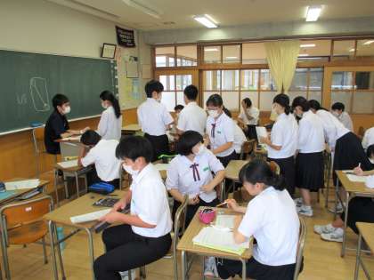 今日の総合的な学習の時間では、「感染症と平和」に関する課題設定と課題追究を行いました。課題がうまくまとまらない生徒は、先生や友達に相談し、アドバイスをもらって課題を見付けました。各クラスに配置されているパソコンを利用して、課題追究している生徒もいました。