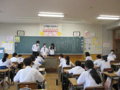 本日5限、1学年は級長・耕心委員が中心なって学級会を開催しました。学級会のテーマは「よりよいクラスに向けて」です。学年生徒会で実施したアンケート「クラスのよい点と課題」をもとに、学級会の準備を進めてきました。