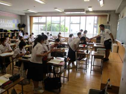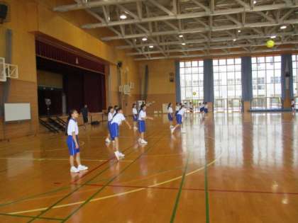 1,2組の授業です。継続的にいろいろな種目に取り組み、それぞれの記録を測定しています。今日は、1組が握力測定と記録の整理、2組がハンドボール投げに取り組みました。