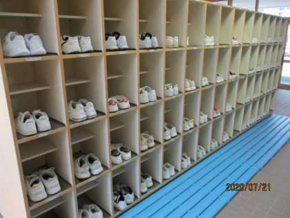 写真右:耕心委員の呼びかけで整然とした下足ロッカー