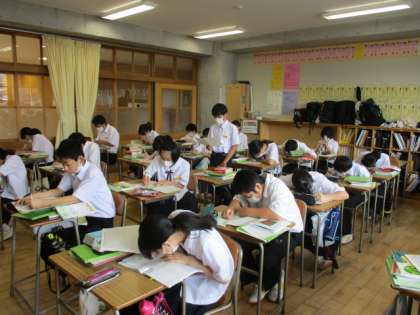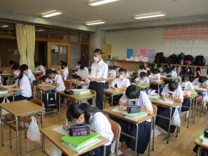 4組、5組の授業です。「自分の好きなもの」をテーマにして分かりやすく書いた作文をみんなに聞いてもらいました。食べ物、学期、曲、スポーツ、生き物、本、遊園地など、いろいろなテーマがありました。選んだテーマにその人の人柄が表れます。