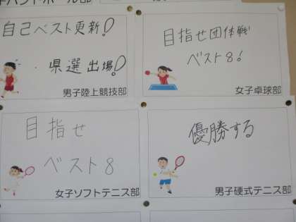 2学期の最初の行事であるスポーツ大会が終わり、次は18日(金)から始まる新人大会です。大会当日まで10日間となり、気持ちもより強くなってきています。そこで、各部長に新人大会の目標を記入してもらいました。努力を惜しまず、目標達成できるようにがんばりましょう。