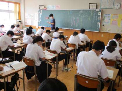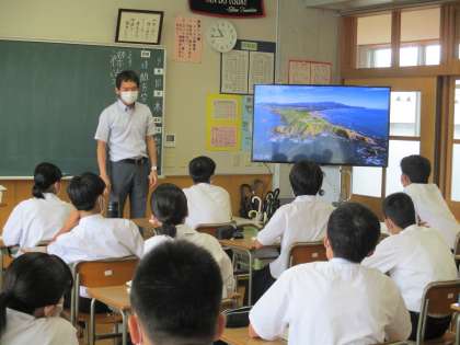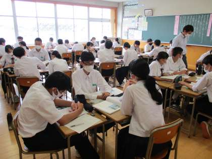 道徳の時間に「襟裳のこと」という資料を読みました。北海道日高山脈の南端に位置する襟裳岬で繰り広げられた、人間と自然の関わりにおける壮絶なドラマ。ICT機器を使用した導入、本文を細かく分けての範読、互いの考えを伝え合うグループ活動等、工夫しながら授業を進めました。生徒たちは、自然の崇高さや自然環境を大切にすることの意義について考えを深めていました。