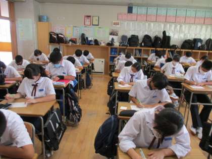 英語では、There is / There are 構文の基本文テストを行いました。このテストのために、基本文3文を10回ずつ書く課題が出ていました。練習の成果が出せたかな?