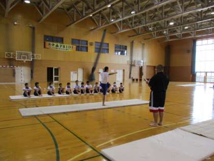 体育では、女子はサッカーを、男子はマット運動の学習を行っています。本日、男子はマット運動のテストを行いました。練習の成果が出せたかな?