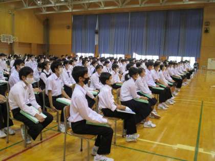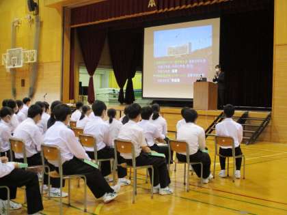 国立高等専門学校、私立高校、県立高校から5つの学校の先生方に来ていただき、学校の概要や入試制度について説明していただきました。各校に独自のコース等の特色があり、学習環境が整っている様子や部活動が盛んな様子を見て、生徒はメモをとったりパンフレットを見たりしながら高校生活をイメージしました。