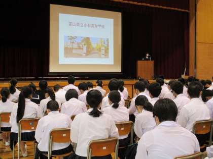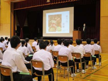 13日(火)に引き続き、本日も体育館にて高等専門学校・高等学校説明会を行いました。県立学校5校に来ていただき、各校の学科やコース等の特色を話していただきました。2日間を通して、生徒たちにとって自分の進路を見つめ直すよい機会になったようです。