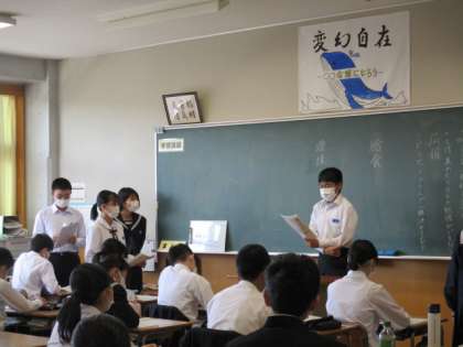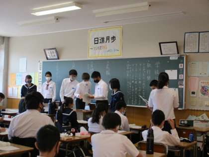 本日、生徒会執行部および各専門委員のよって計画された活動計画案を全校生徒に伝える学級討議が行われました。後期の活動からは、2年生が中心となり、より良い呉中になるようにたくさんの案を考えていました。各学級では、委員会に所属する委員が説明し、質問に答えていました。