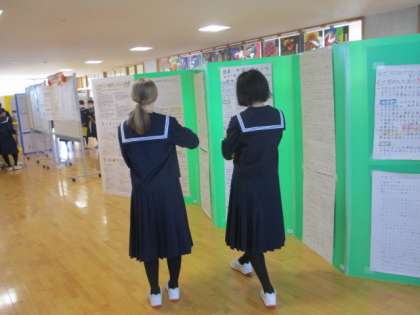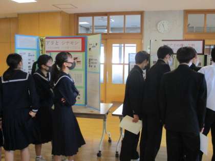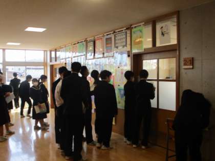 各学年の教科の作品、総合的な学習の時間の成果を見学しました。普段、部活動等の時間にしか交わらない他学年の生徒の作品を興味津々で鑑賞しました。