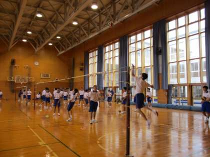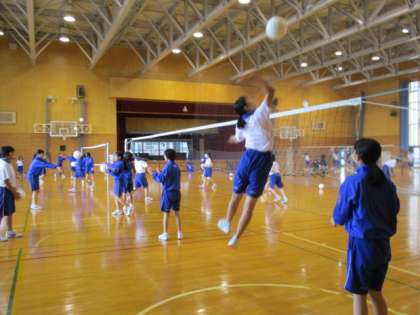 保健体育では、男女ともバレーボールを行っています。今日はスパイク練習です。手投げで上げたボールに打点の高いところで打ち抜くタイミングの練習です。ズバ〜ンと床にボールがたたきつけられる強烈なスパイクを打てた生徒もいました。