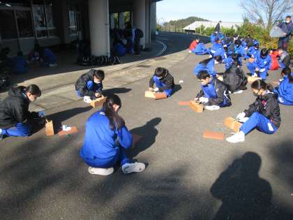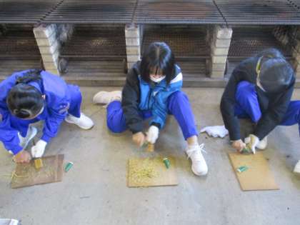 最初の活動は「竹スプーン作り」です。全員、軍手を装着し、小刀を使って材料の竹を削っています。このスプーンを使って、カレーライスを食します!