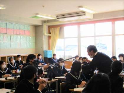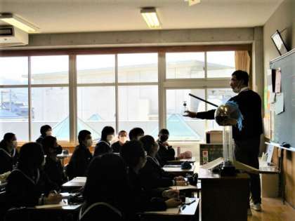 理科では、静電気について学習しました。静電気を発生させたバンデグラフに恐る恐る触っています。