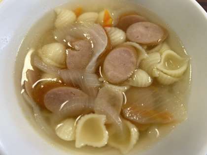 スープのマカロニは貝(シェル)でした。これだけたくさんのマカロニが入っていれば、美味かろに!