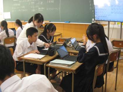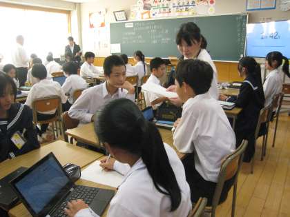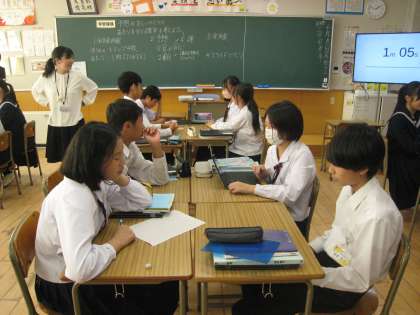 2年生は、確率の授業で「予想が正しいかどうか、あたりをひく確率を考えよう」という課題に取り組みました。トランプ4枚の中に1枚ジョーカーを混ぜて、そのジョーカーをあたりとして実験を重ねました。単純なゲームですが、どのグループも楽しそうでした。各自考えはまとまったでしょうか?