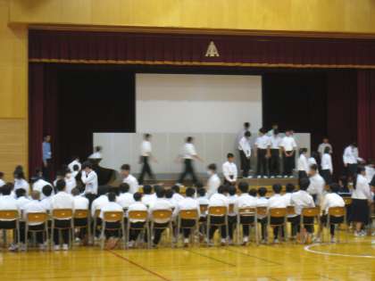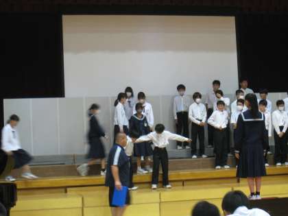 中下:歌い終わったクラスが退場し、次に歌うクラスがステージに立つ動きもスムーズになるようリハーサルをします。