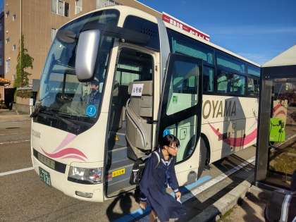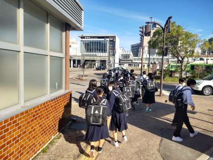 先頭を走るA号車が駅に到着!午前中の班別学習がスタートです!