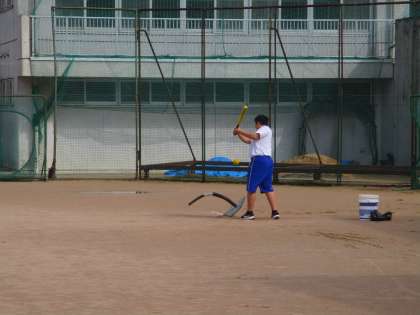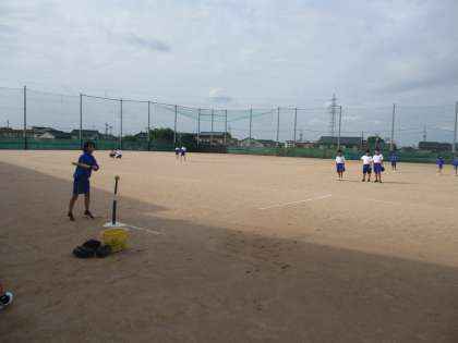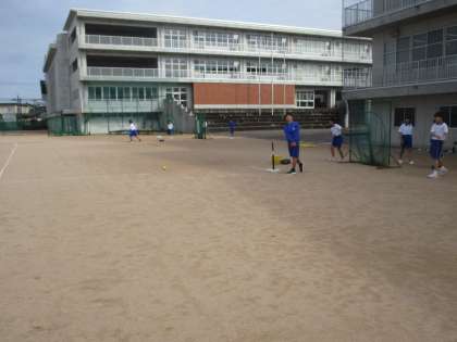 安全に配慮し、打者とボールの係以外の生徒は、ネットの後ろで待機する様にしています。