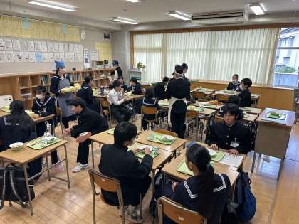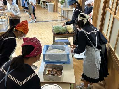 授業も終わり、楽しみな給食の時間です。 当番が素早く準備をします。