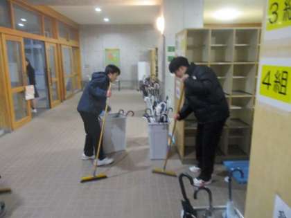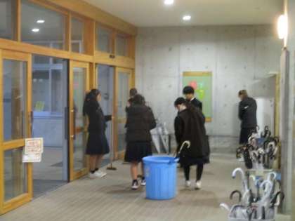 除雪当番ですが、雪が積もっていないため代わりに生徒玄関を掃除しています。
