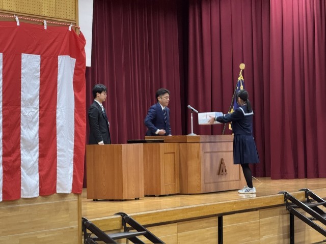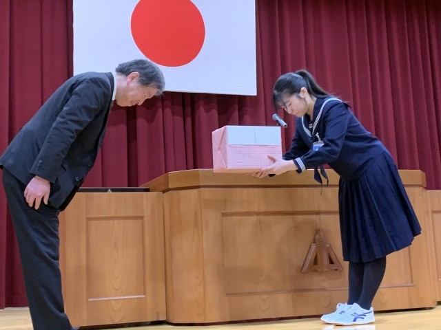 同窓会入会式、PTA卒業記念品贈呈式が行われました。同窓会からは卒業証書フォルダー、PTAからは印鑑とコサージュを頂きました。ありがとうございました。