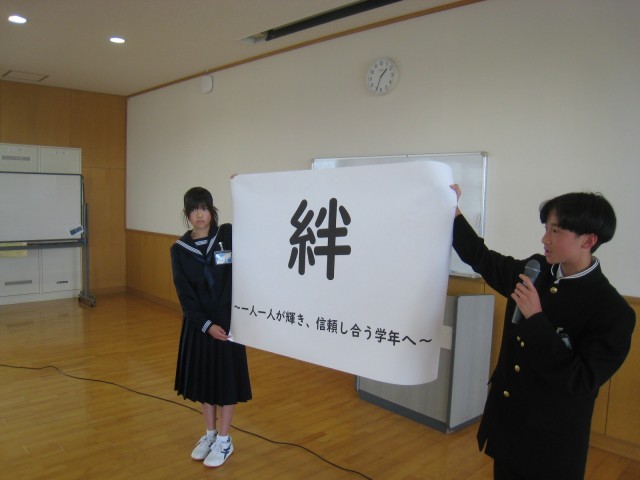 5限目、学年集会を開き、学年スローガンが発表されました。決定したスローガンは『 絆 ~ 一人ひとりが輝き、信頼し合う学年へ ~ 』です。このスローガンを実現すべく、1学年みんなで色々なことに挑戦し、絆を深めていってほしいです!放課後には各クラスの学級役員が集まり、学年・学級の中心であるという意識を高めました。