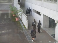 天気予報のとおり、雨が降ってきました。傘を持っていない生徒と一つの傘に入って下校...