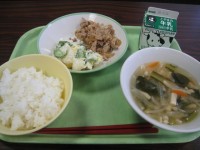 今日の給食は、 ごはん 牛乳 豚肉のジャンロー ポテトサラダ 高野豆腐のみそ汁で...