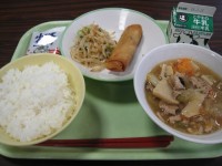 今日の給食は、 ごはん 牛乳 春巻き 香味和え 八宝菜 味付け小魚です。 沖縄県...