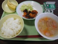 今日の給食は、 ごはん 牛乳 鶏肉とレバーのケチャップからめ ゆでキャベツ マカ...