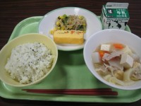 今日の給食は、 菜めし 牛乳 千草焼き チンゲンサイソテー 豚汁です。 豚汁(とんじる)の具材、何が美味しいか試すのに、お金を投じる!