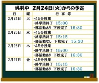おはようございます。朝の様子です。学年末考査3日目(1、2年生)時 間1年生2年生1 限8:35~9:25理英2 限9:40~10:30保体美3 限10:45~11:35英理