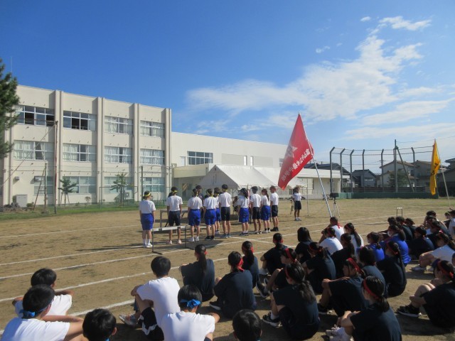 (写真下:体育大会実行委員の声かけのもと、団リーダーがそれぞれの団のためによく動いてくれています)
