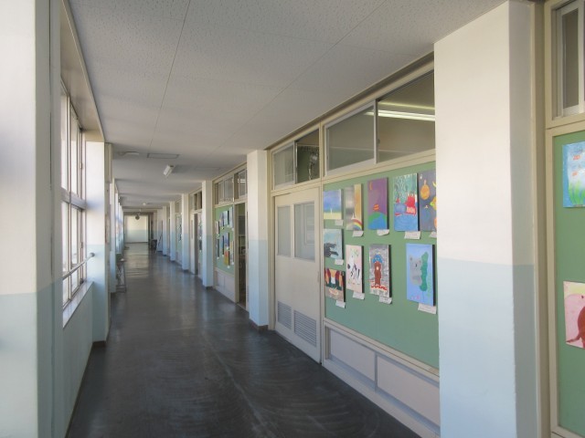 (写真上:教室前の廊下には、美術の絵画が掲示されました)
