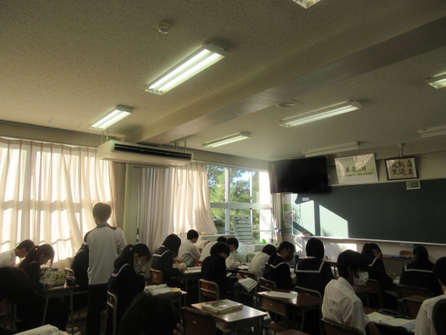 (写真下:2B 社会 テスト前にワークに取り組んでいます)