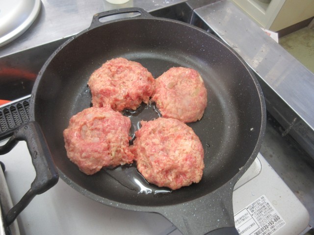 (写真中:大き目のハンバーグに少しずつ焦げ目がついてきました。「いい匂い!」)