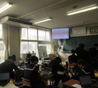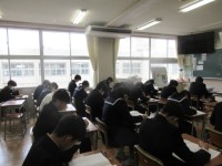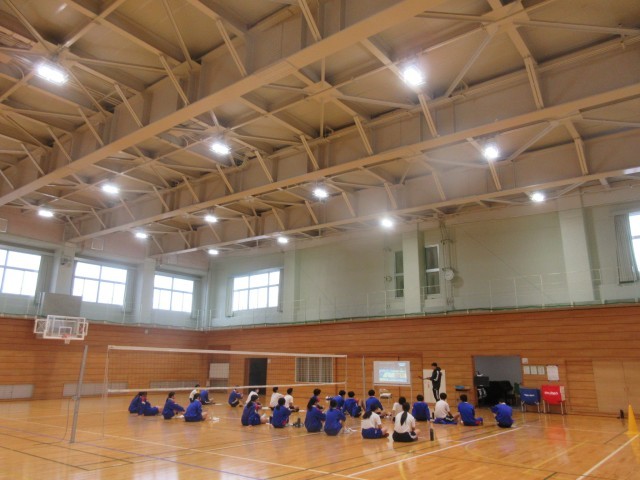 (写真上:3A 体育 バレーボールの動画を見てから練習です)