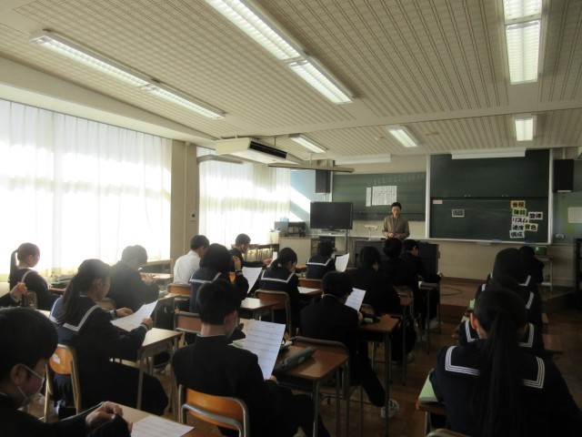(写真上:2A 音楽『水橋学園』の校歌について学んでいます)