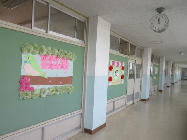 (写真上:1学年が作ってくれた「おめでとう」の掲示物が校内に貼られました)