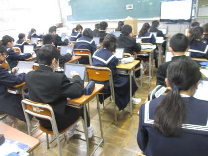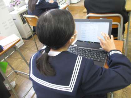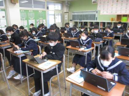 クロムブックで生活アンケート実施 公開日 2021/04/28 更新日 2021/04/28 第1学年 タブレット端末「クロムブック」を用いて、1Aの生徒が生活アンケートに答えました。全員に共通の質問項目が表示され、当てはまる項目を各自がクリックして答えていました。 はじめは慣れていない様子だった生徒ですが、教えあったり聞きあったりして全員スムーズに回答できました。これからもさまざまな場面で端末を活用し、学校生活を充実できるよう工夫したいです。