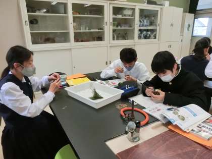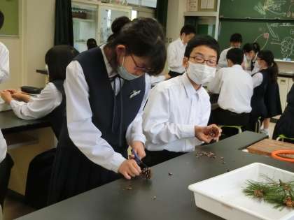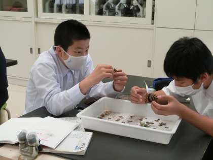 裸子植物の花のつくり確認してマツの種子をさがしました。