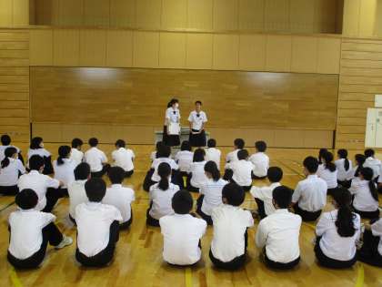 全校学年レクリエーション その1 公開日 2021/06/26 更新日 2021/06/26 生徒会 5・6時間目に生徒会執行部企画の全校レクリエーションを行いました。全校生徒を3つのグループに分けてジェスチャーゲーム、連想ゲーム、○×クイズを生徒は楽しみました。 写真は執行部の生徒が企画の説明をしている様子です。